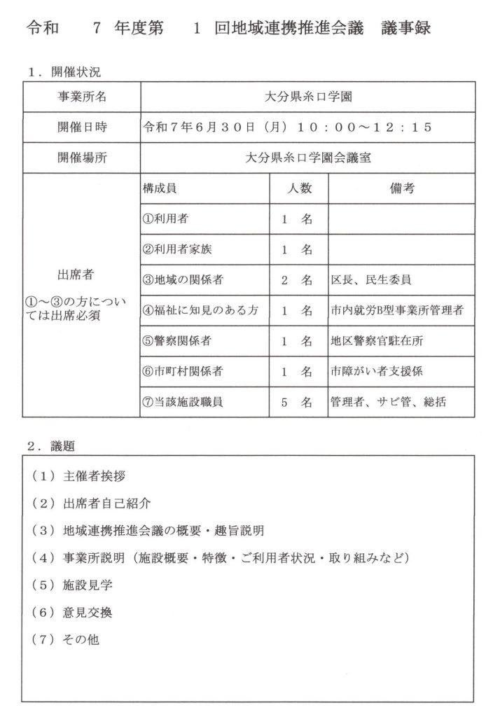 猿渡区長様、民生委員様、豊の郷管理者様、糸口警察官駐在所様、宇佐市障がい者支援係様、ご利用者代表者様、保護者代表者様にお集まりいただき、地域連絡推進会議を開催いたしました。