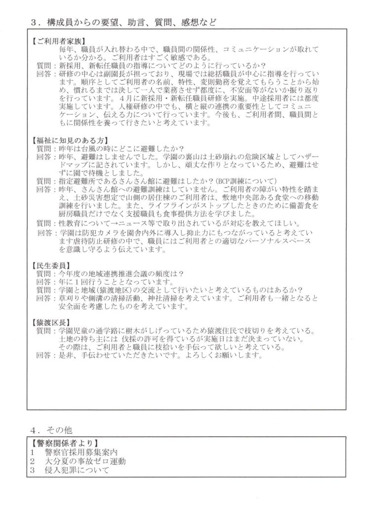 また、糸口学園の令和7年度事業計画、ご利用者の状況、地域公益事業計画、研修計画、防災計画(BCP計画)についても説明し、質問、意見をいただきました。