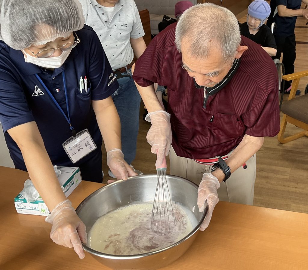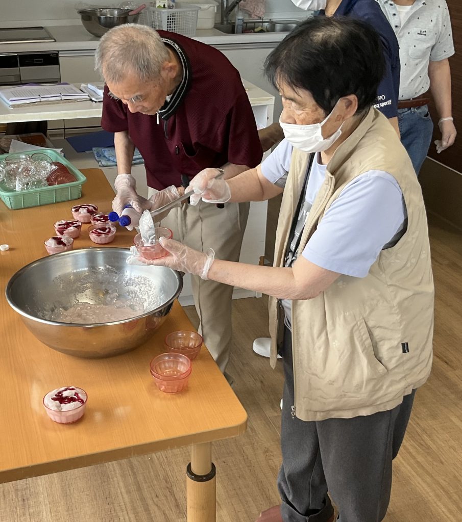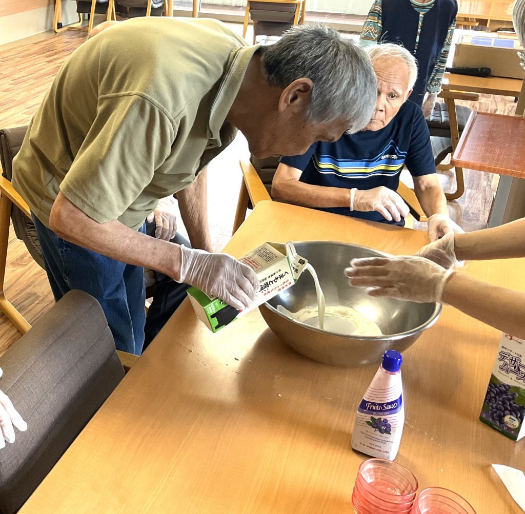 牛乳を入れたり、混ぜたり、ソースをトッピング
