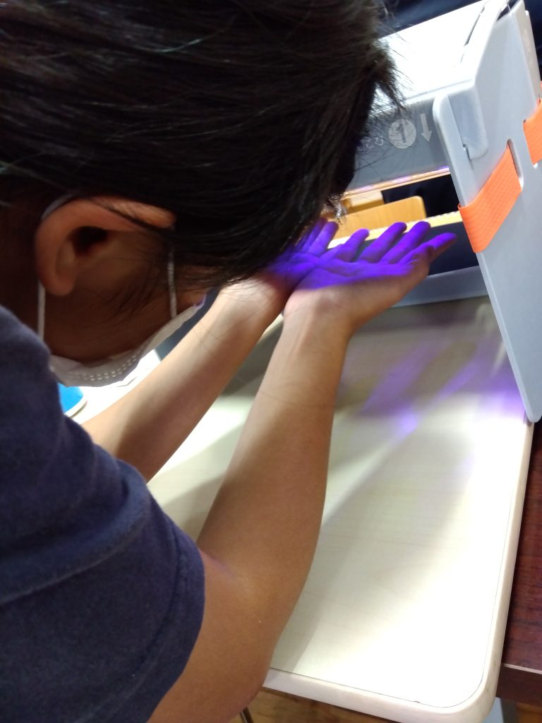 専用の液を手全体に付け(汚れに見立てて)、石けんを付け手洗いでどのくらい汚れが落ちたか専用のライトで洗い残しを確認しました😆✨