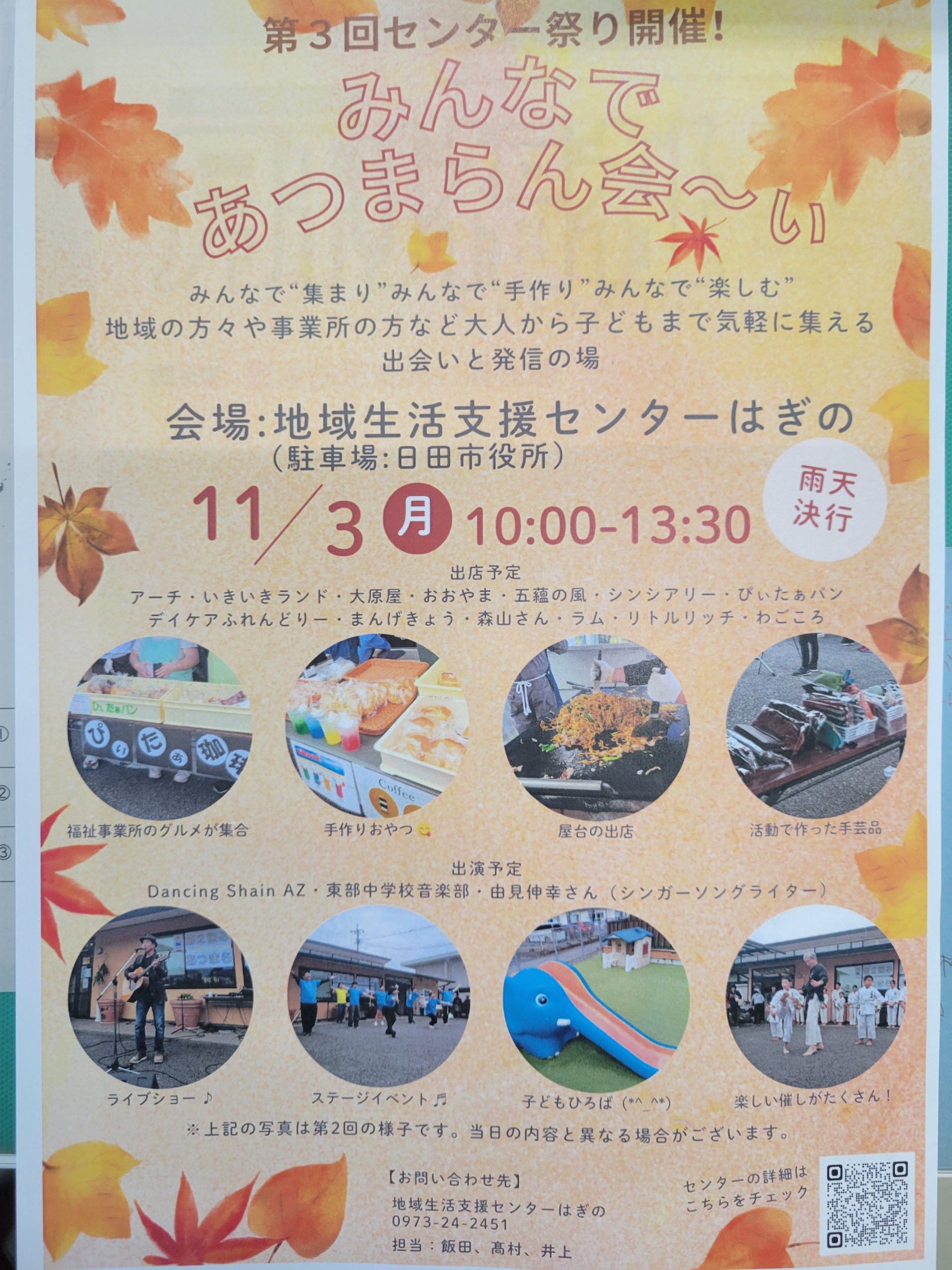 みんなであつまらん会~ぃ/地域生活支援センターはぎの 令和7年11月3日(月)にみんなであつまらん会~ぃ(センターまつり)を開催いたします。 お近くにお越しの際はぜひ遊びにきてください(#^^#) ぴーすのお友達とチラシをパチリ📸 トップに戻る