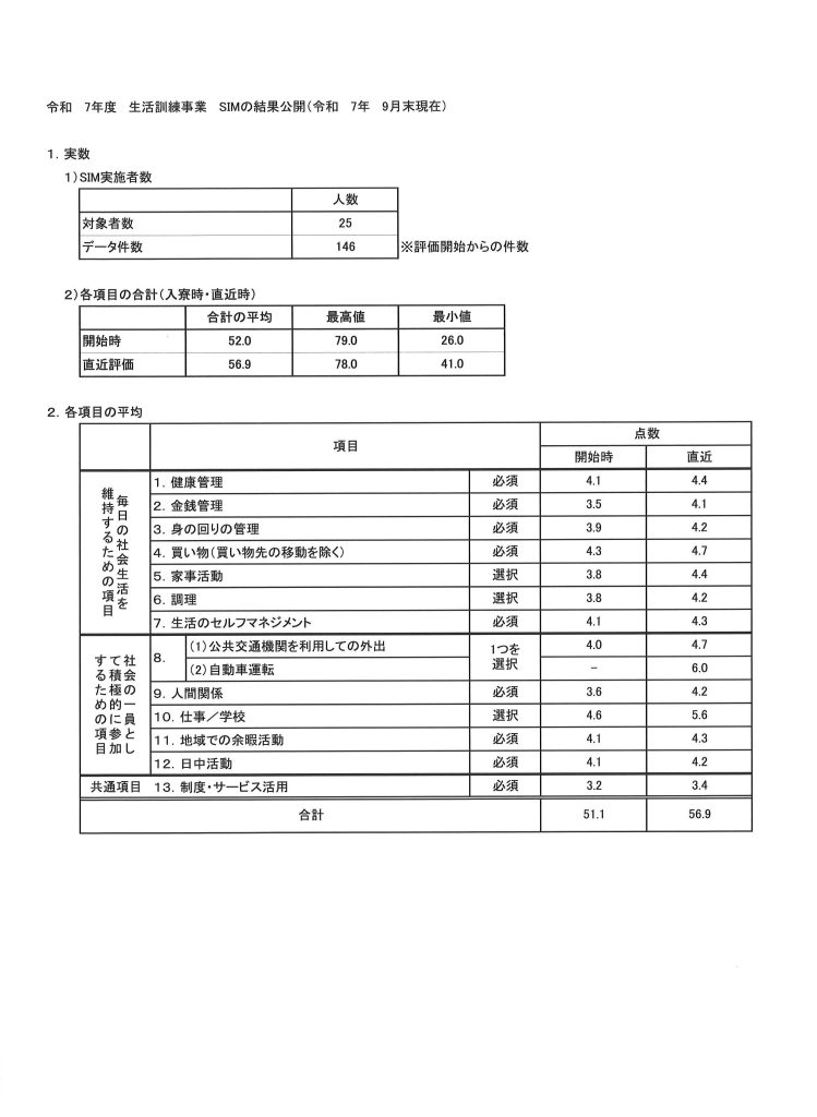 ~SIM評価 結果公表~ 9月のSIM評価(社会生活を維持するために必要な項目7項目と、社会の一員として積極的に参加するための活動の6項目を採点するもの)は以下のとおりです。次回公表は3か月後の予定です。 R7.9月末SIM全体評価ダウンロード トップに戻る