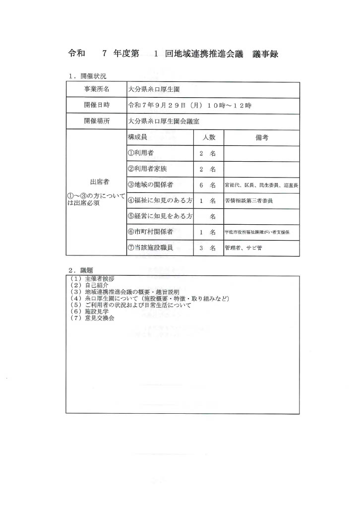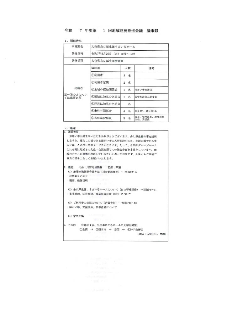 令和7年度第1回地域連携推進会議 令和7年度第1回地域連携推進会議を行いました。 今回は区長、副区長、第三者委員、宇佐市障がい者支援係、厚生園職員が集まり会議を行いました。 ~地域連携推進会議の議事録~ トップに戻る