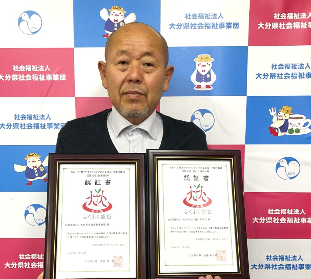 働きやすくやりがいのある福祉・介護職場を目指す県の「ふくふく認証」の交付式が令和7年11月14日にありました。大分県社会福祉事業団は障害福祉と介護、2つの分野での認証を受けました。