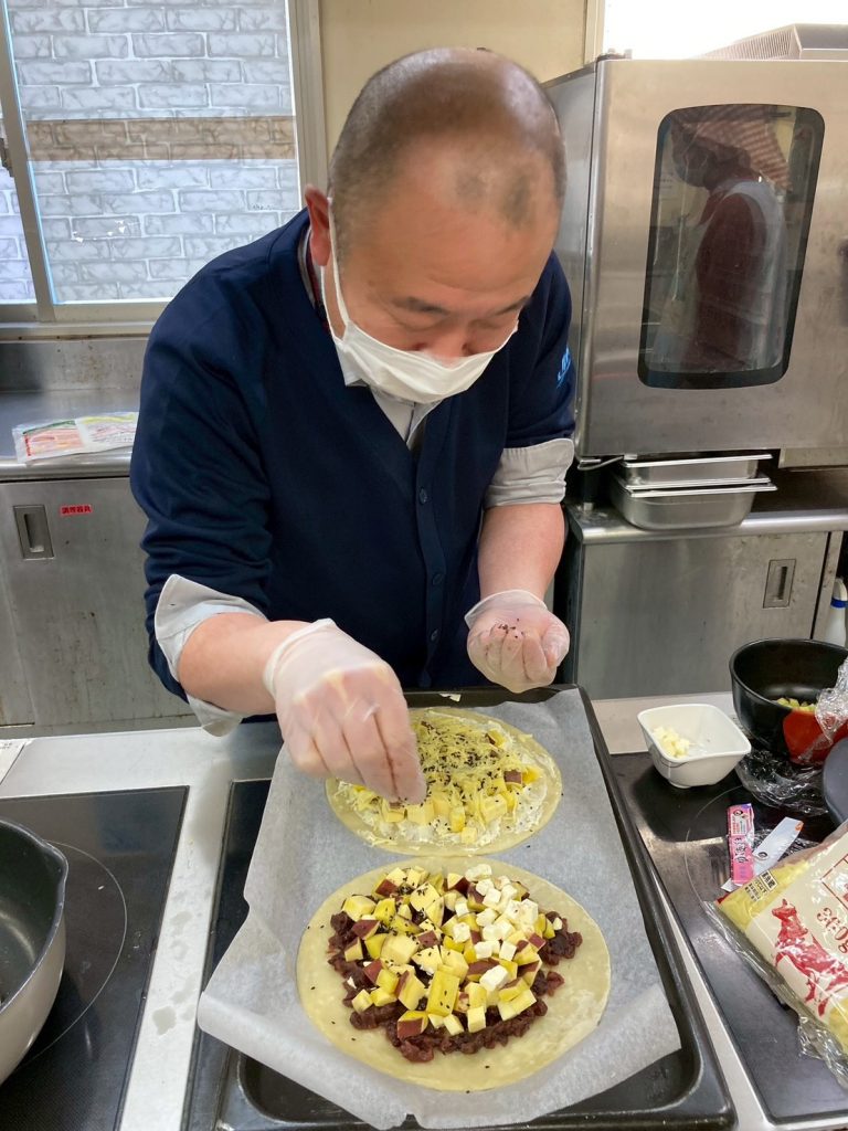 完成!あんこ、職員の作った芋の甘露煮、ホイップクリーム、抹茶を使ったピザです😋