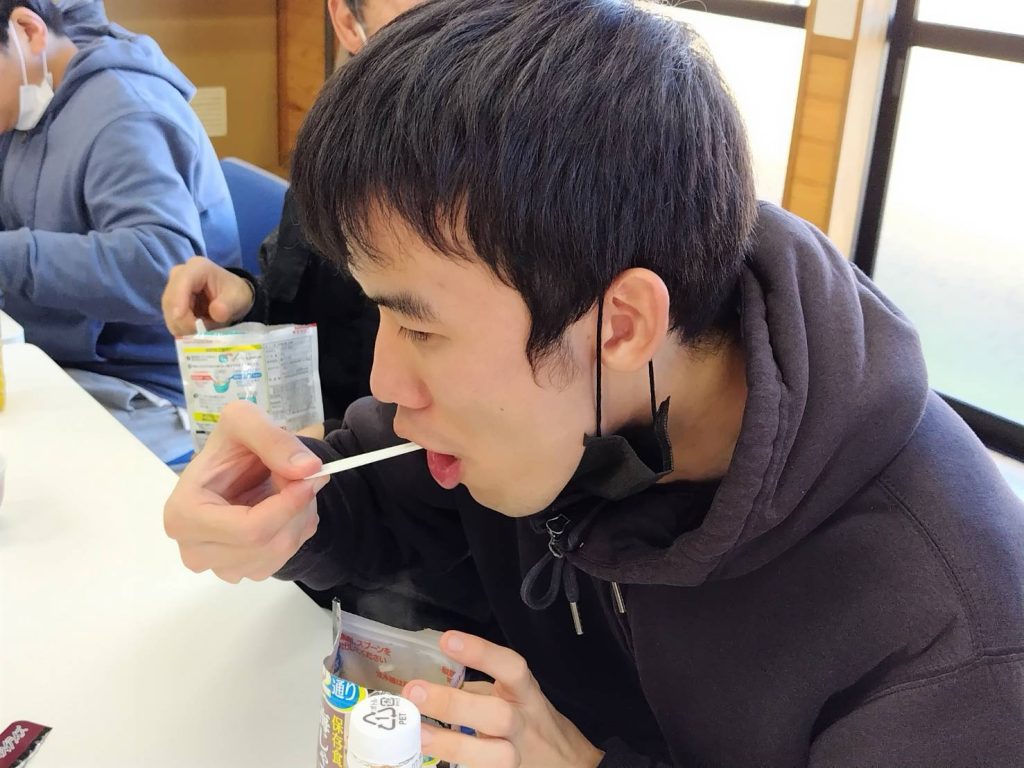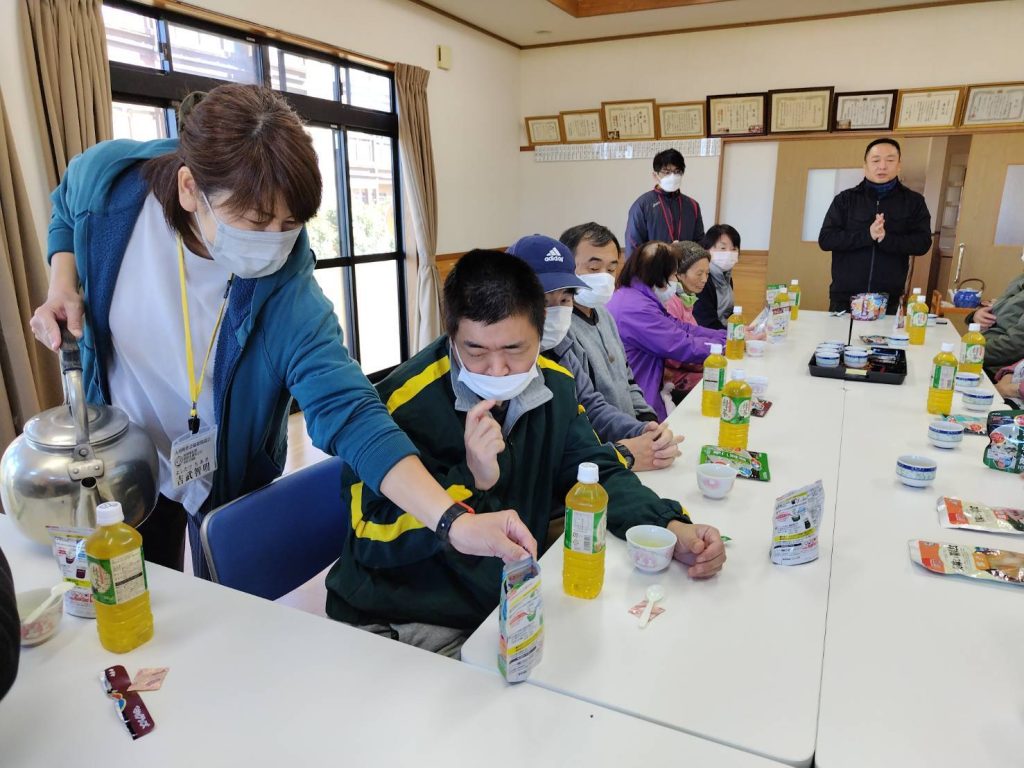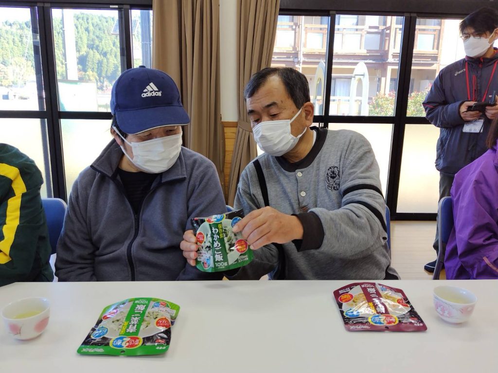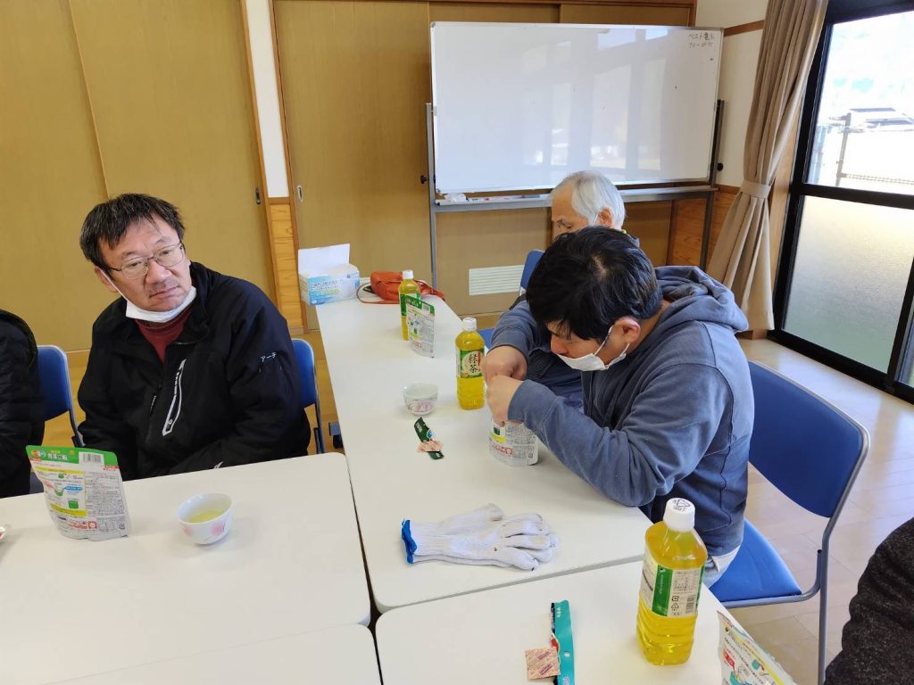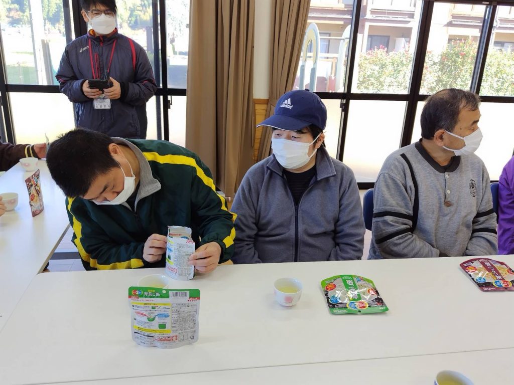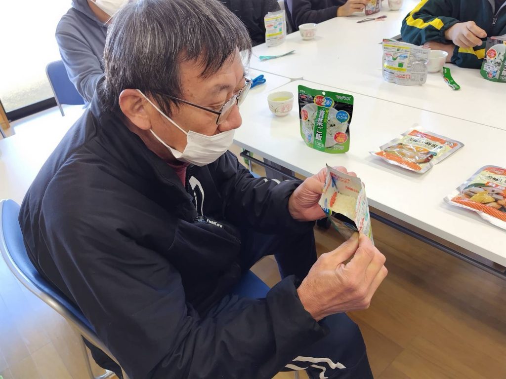 恵良団地居住者と一緒に防災士から防災に関する話を聞いたあと、防災食の試食をしました