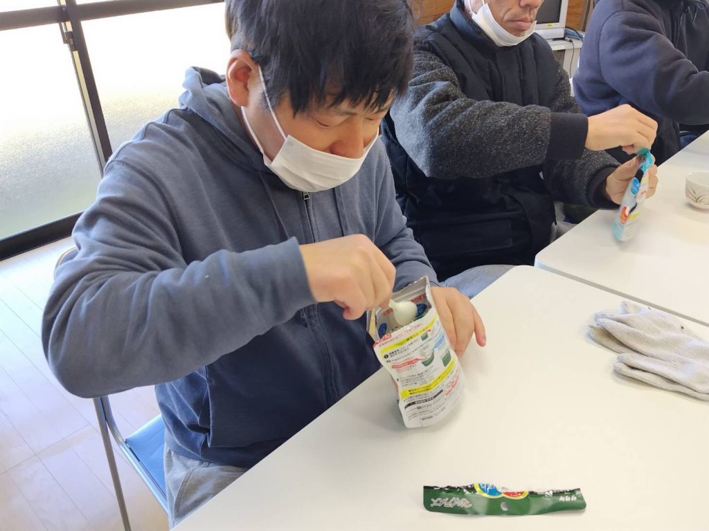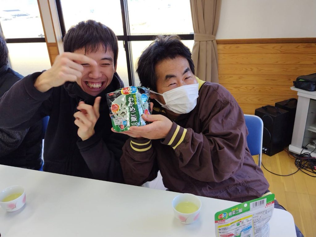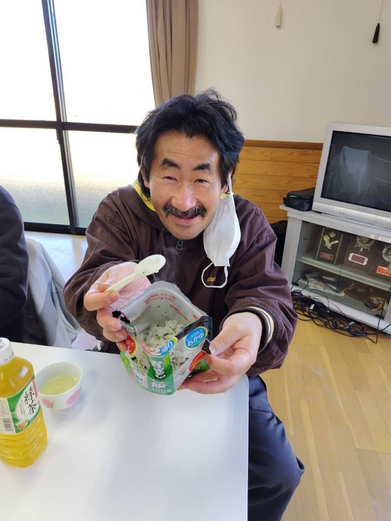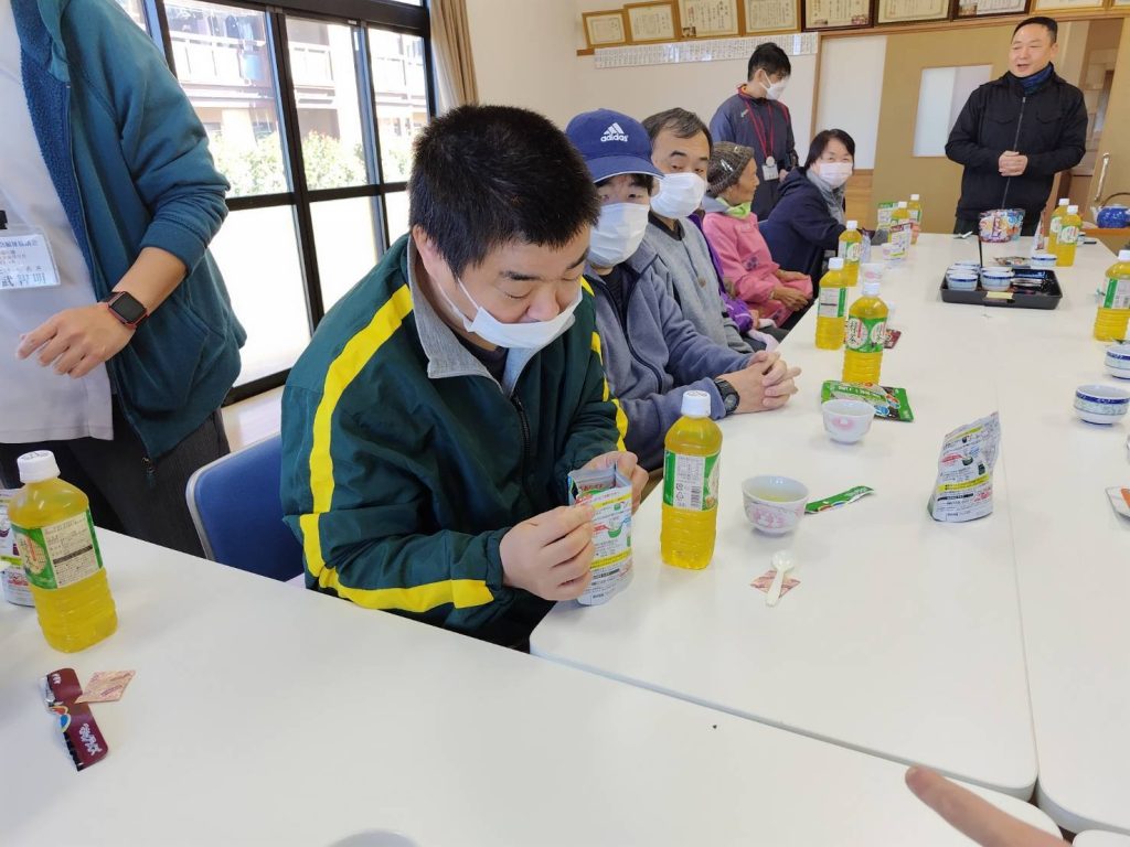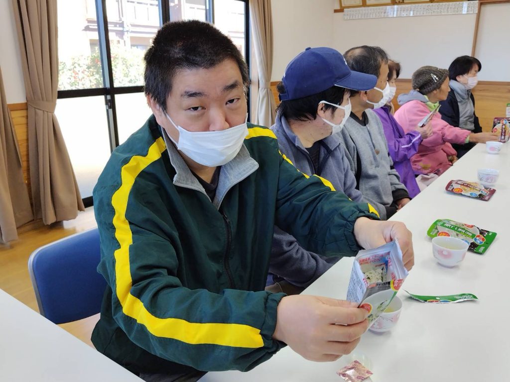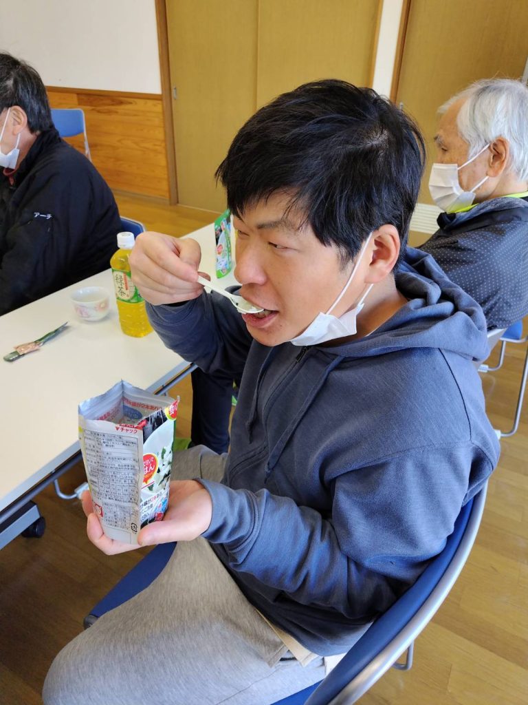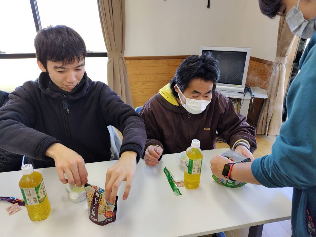 恵良団地居住者と一緒に防災士から防災に関する話を聞いたあと、防災食の試食をしました