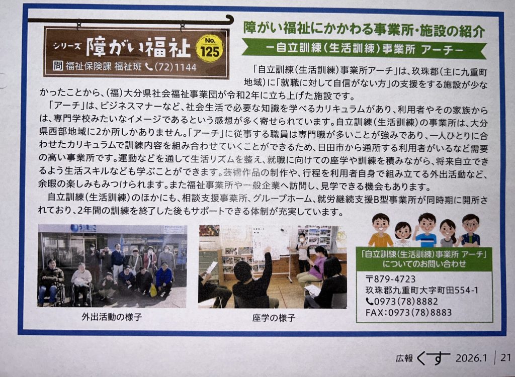 玖珠町の広報誌に紹介されました! この度、自立訓練事業所アーチの取り組みが玖珠町の広報誌に紹介されました。 自立訓練事業所アーチの支援内容や雰囲気が伝わる内容となっております。 お近くの方は是非ご覧ください。 トップに戻る
