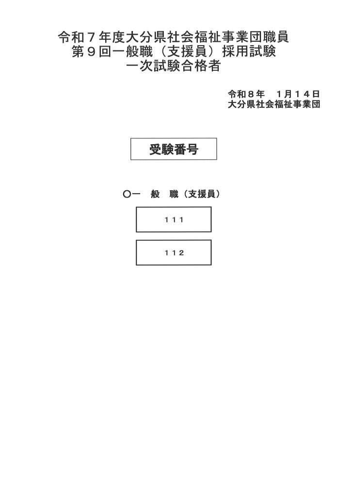 令和7年度職員採用試験 第9回一般職(支援員)一次試験結果発表 この度は多くの方に受験いただき、ありがとうございました。 試験の結果については以下のとおりです。 なお、合格者の方には別途連絡をいたします。 トップに戻る