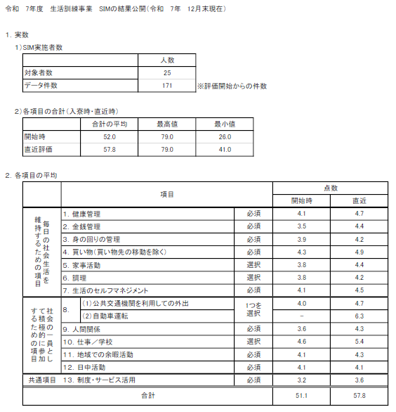 ~SIM評価 結果公表~ 12月のSIM評価(社会生活を維持するために必要な項目7項目と、社会の一員として積極的に参加するための活動の6項目を採点するもの)は以下のとおりです。次回公表は3か月後の予定です。 トップに戻る