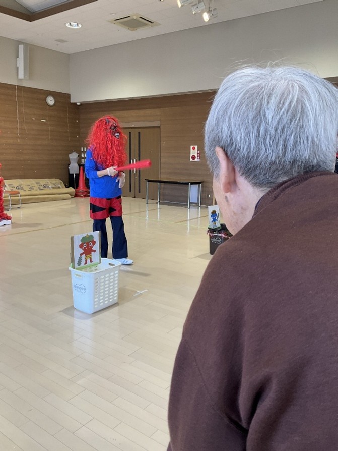 ご利用者も節分のレクリエーションを行いました!鬼の的にめがけて皆さんで玉入れを行いました⚡