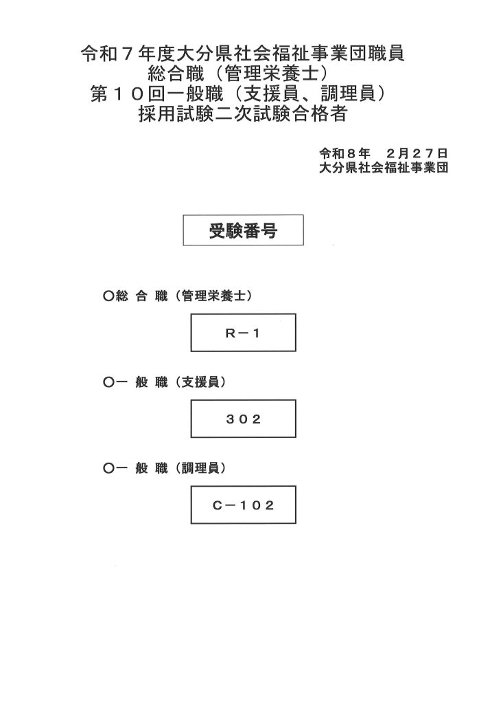 令和7年度職員採用試験 総合職(管理栄養士)、第10回一般職(支援員、調理員)二次試験結果発表 この度は多くの方に受験いただき、ありがとうございました。 試験の結果については以下のとおりです。 なお、合格者の方には別途連絡をいたします。 トップに戻る