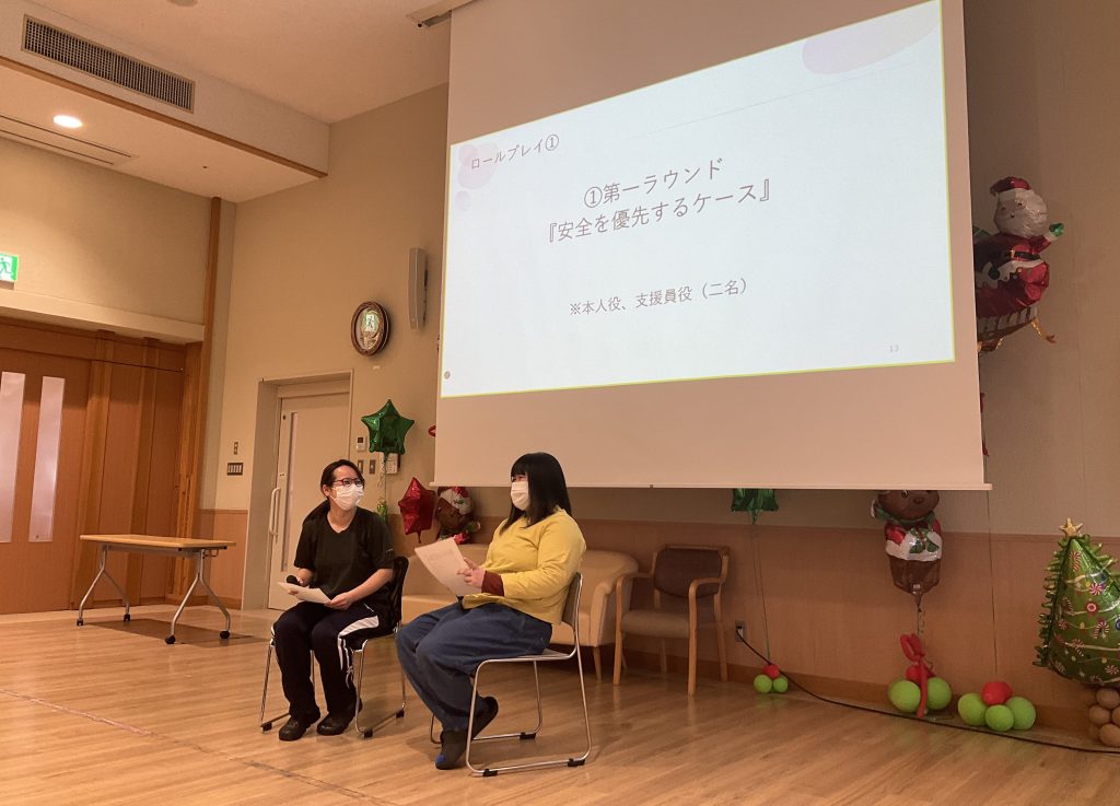 研修では制度や基本的な考え方を再確認するとともに実際の支援場面を想定したロールプレイを行いました。ご利用者の思いをどのように受け止め、どのように選択を支えるのか職員同士で考え、学びを深める機会となりました。今後も継続的な研修を通して、より質の高い支援の提供に努めてまいります。